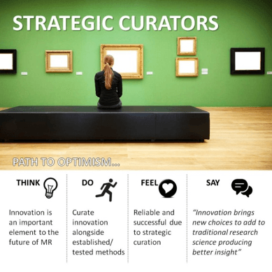 Characteristics: “Strategic Curators” place a similar importance on innovation, but focus on the need to strategically curate innovative techniques alongside more established/traditional methods. The “baby” of established strategic research and analytic techniques is safe with these researchers, even as they discard the “bathwater” of tired and outdated practices.