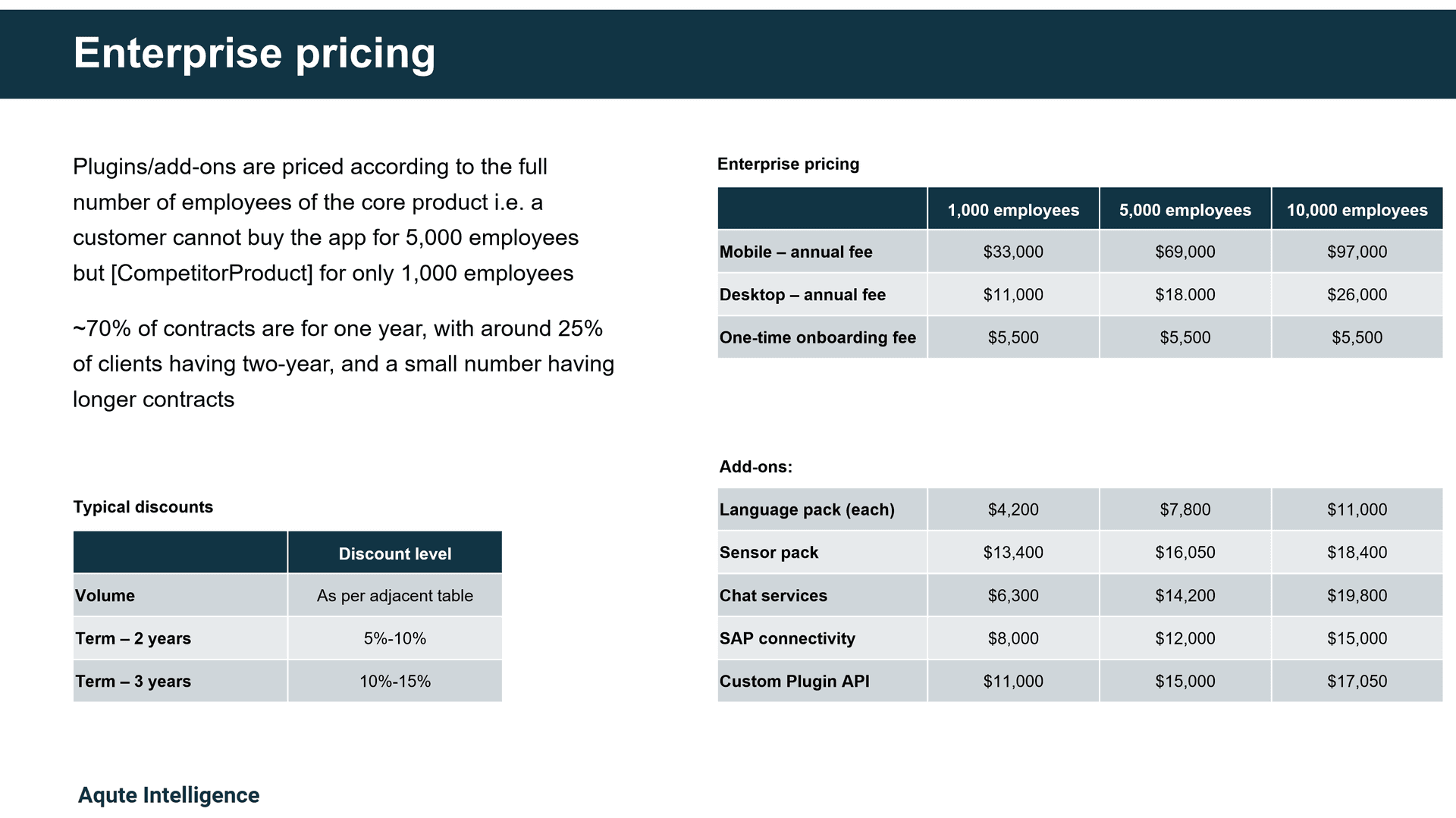 Beat your competitors. Aqute will give you their pricing, customer list, feature table, sales pitch, customer sentiment. Everything, on a plate. So your salespeople can create better proposals and your marketing can put you ahead. Aqute uses primary fieldwork and B2B mystery shopping to get you detailed, accurate data you can use right away.
