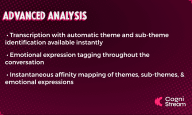 CogniStream AI is an end-to-end automated qualitative research software. Unlike synthetic AI-generated responses, every insight originates from genuine human conversations, reported by the intelligent emotion AI.