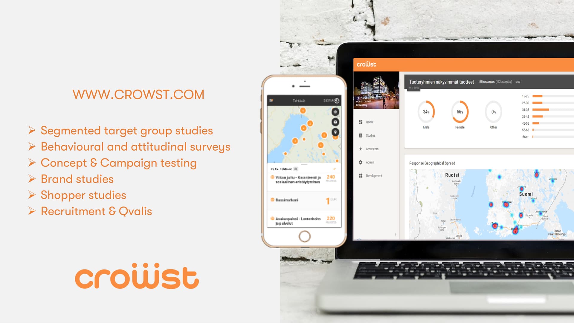 Crowst is a modern and agile consumer-focused research company in Finland. Using our proprietary digital service platform and mobile user base, we offer segmented consumer studies, behavioral surveys, shopper insights, concept and campaign testing, brand tracking, and participant recruitment (for qvalis) services.