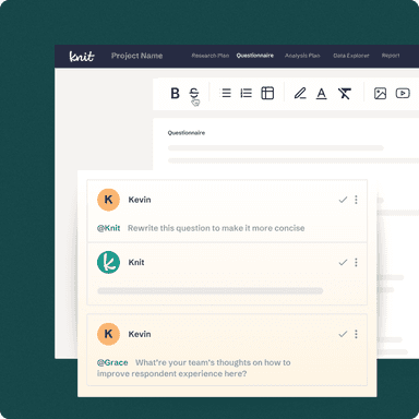 With Knit, you gain the freedom to focus on the big picture, driving action and innovation with every study. No more compromises between speed and depth or time and money — Knit delivers it all.