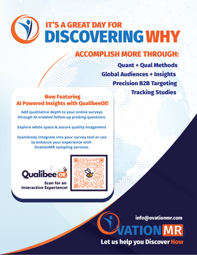 QualibeeOE is our AI-enabled online survey and interview question probing tool that gives you deeper, more meaningful insights from quantitative and qualitative studies. Qualibee also provides response scoring for better survey data quality.