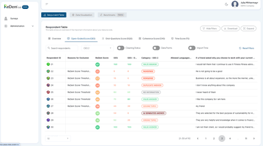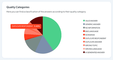 The quality checks include the analysis and categorization of open-ended responses, including detecting duplicates, gibberish, off-topic content, or AI-generated text. ReDem also performs behavioral analytics to examine keystroke patterns in text fields and distinguish between human typing, bot-like behavior, and copy-paste input. In addition, the tool runs speeding and straightlining checks and applies AI-based coherence analysis to assess whether a respondent’s answers are consistent and plausible throughout the interview.