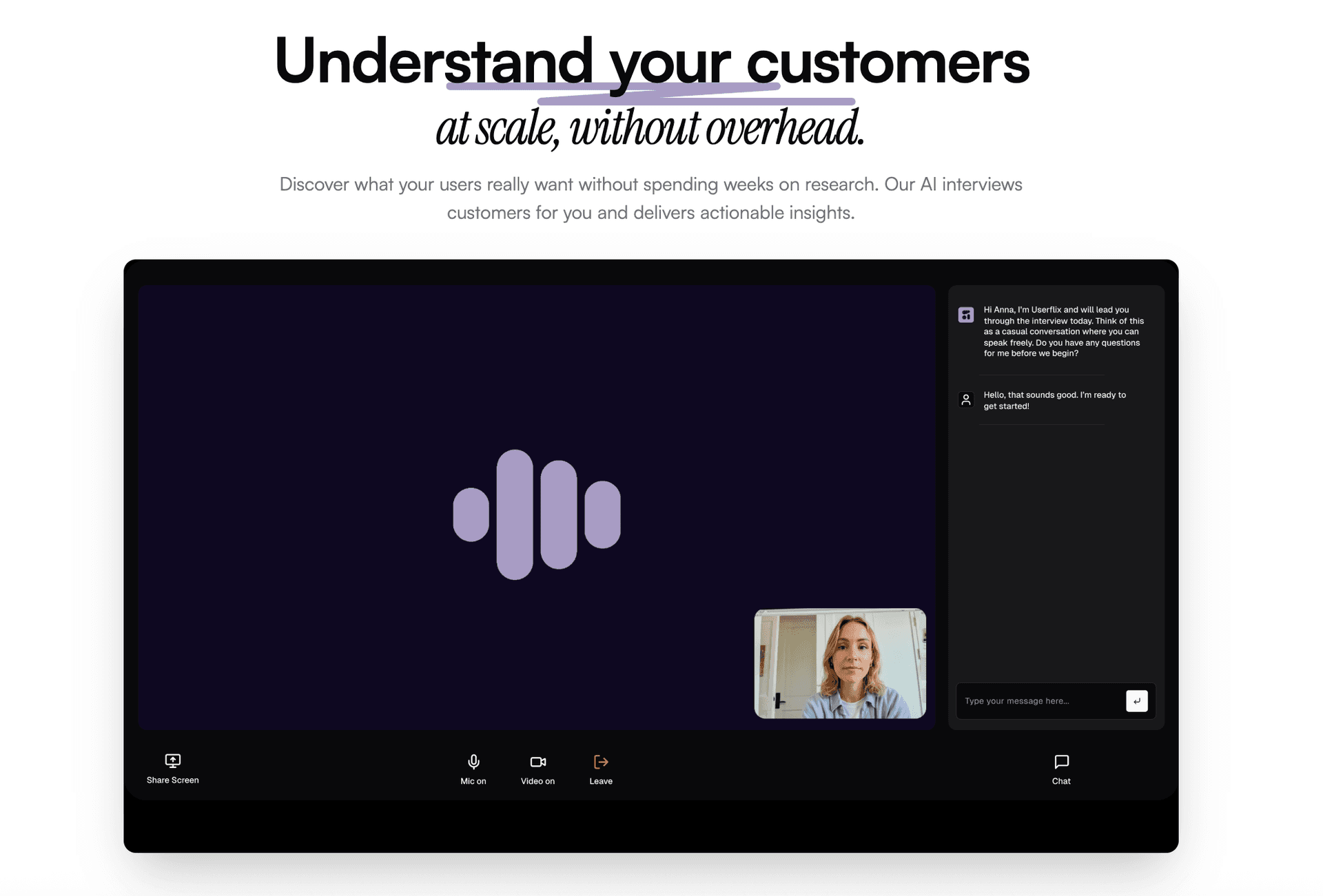 AI platform that automates qualitative customer research via asynchronous, multilingual interviews and delivers real-time, actionable insights.