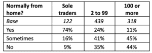96% of the people working for larger companies said they were working from home, 3% said they were not working (e.g. furloughed). People working for small companies were similar to the larger companies, with 88% working from home, and 6% not working. The sole traders reported that 75% of them were working from home, but 22% of them were ‘not working’.