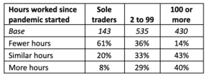 In Wave 2 we asked people whether the number of hours worked had changed since the start of the pandemic. We received three very different sets of answers, based on company size. People in the smaller companies were fairly evenly split, with approximately one third saying more hours, the same hours, or fewer hours. Among the sole traders nearly two-thirds saying they were working fewer hours, and only 8% were working more hours. In contrast, people in the larger companies reported that only 14% of them were working fewer hours and 40% of them were working more hours.