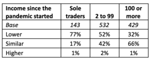 In Wave 2 we also asked what changes people had seen to their income since the start of the pandemic. For Sole Traders this will tend to be a hybrid combination of personal income and trading income, for employees of larger organizations, this will tend to just be personal income. The data showed some big differences in terms of income changes and the size of the company.