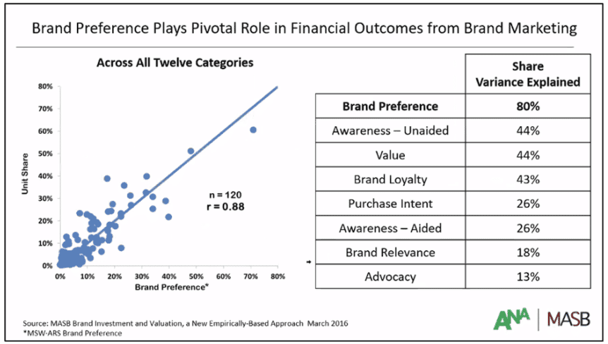 2. The predictive advertising effectiveness tracking metric is Customer Commitment Preference™ (CCPreference™). MASB independently tested nearly 70 different metrics of pre-advertising brand strength (including unaided awareness, value, loyalty, purchase interest, and more). They identified CCPreference™ as the most predictive of actual unit market share with an overall correlation of .88. The study included a diverse set of 120 brands from 12 categories – some highly fragmented while others had few brands; some considered purchases with prices up to $40K while others were impulse categories with items under $1. Uniquely, brand preference showed a strong relationship to unit share across all categories.