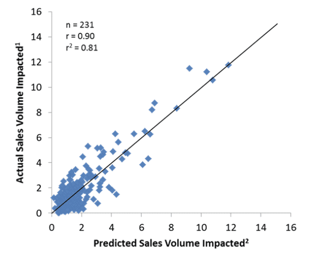 3. Building on CCPreference™, Customer Commitment Persuasion™ (CCPersuasion™) is a unique pre-to-post copy testing metric that establishes the change in a brand’s market share or penetration after advertising. MASB also certified CCPersuasion™ and the metric successfully completed Marketing Metric Audit Protocol. The audit concluded that CCPersuasion™ can quantify the likelihood and magnitude of an ad’s impact on sales volume and market share. One published study that substantiates this conclusion relates the predicted sales volume impacted by advertising to the actual sales volume impacted from independent Marketing Mix Modeling analysis: