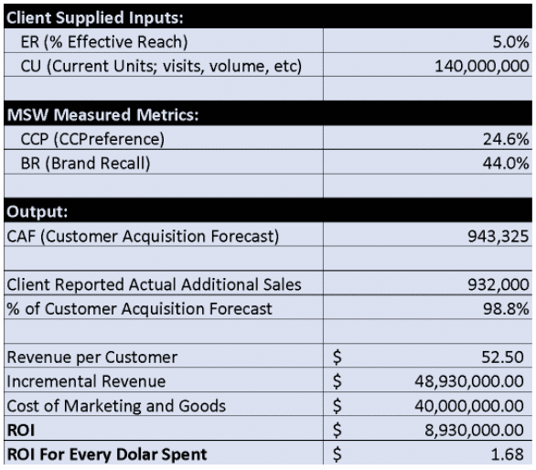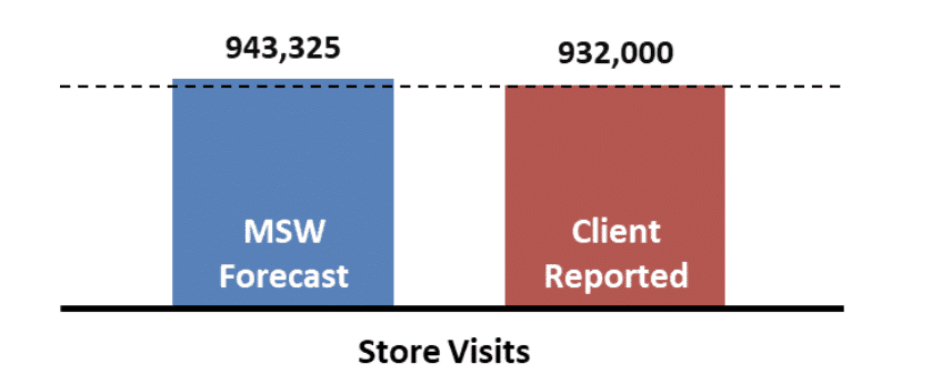In this case study for one of the nation’s largest retailers, MSW Customer Acquisition Forecast™ was for 943,325 store visits, which was within 1.2% of their reported visits. Our client shared their average checkout of $52.50, which enabled us to forecast an incremental revenue of $48,930,000 offset by their cost of marketing and goods produced an ROI of $8,930,000 or +$1.68 for every dollar spent.
