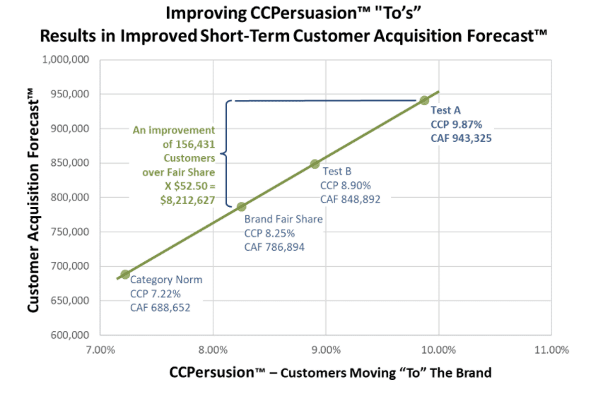 Additionally, if clients can create ads that improve the CCPersuasion™ score (that is, increase the percentage of customers that move to the brand post-advertising) it will result in a higher Customer Acquisition Forecast™.