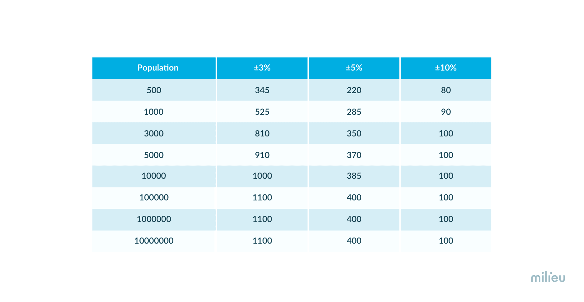 This table lists the sample sizes you need to aim for depending on the target population size and desired margin of error.