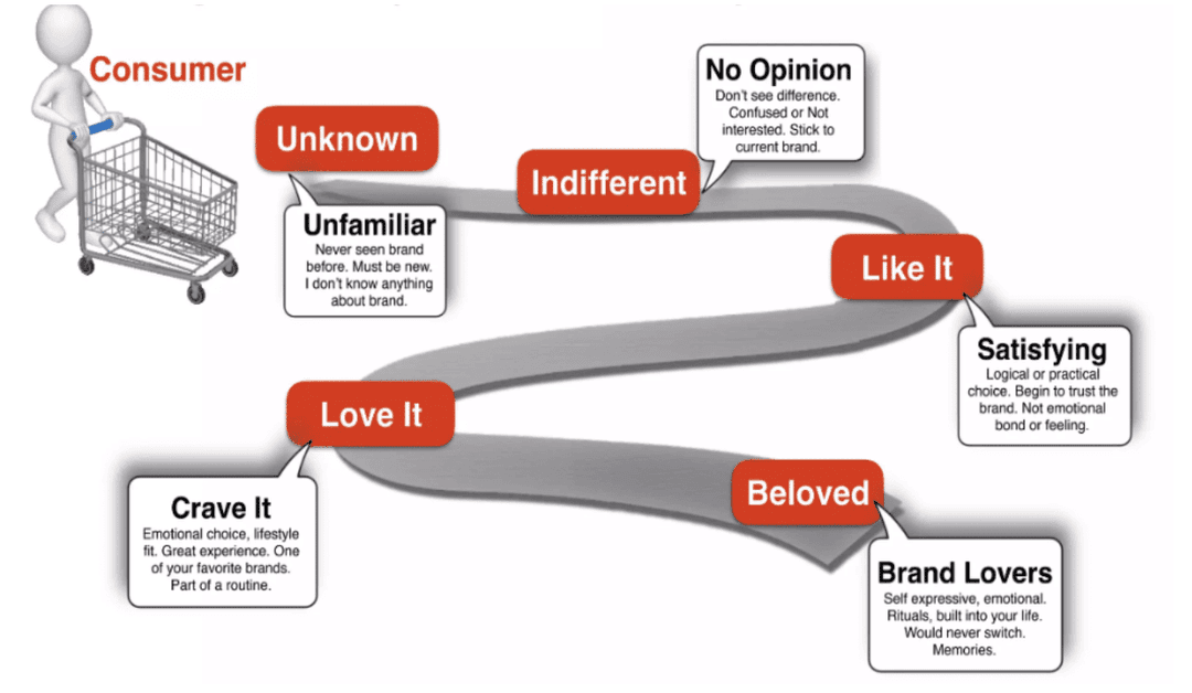 Best represented in the publications from Beloved Brands, Brand Love goes through a journey. In the beginning a new brand that is unknown, must get noticed so consumers see the brand in the crowd. Then the brand builds its positioning in the minds of the consumers. Subsequently, building a trusted following with each happy purchase and tightening bonds with your most loyal brand lovers.