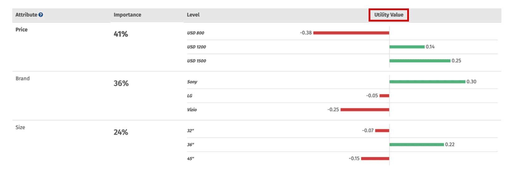 Every time a respondent selects an option, they are by default selecting a specific level. Therefore, when combining all respondents’ answers, Discrete-Choice Conjoint can then identify the importance of each attribute and level (also called utility value) based on the number of times an option with that respective level has been selected – this requires the use of advanced statistical analysis not covered in this article.
