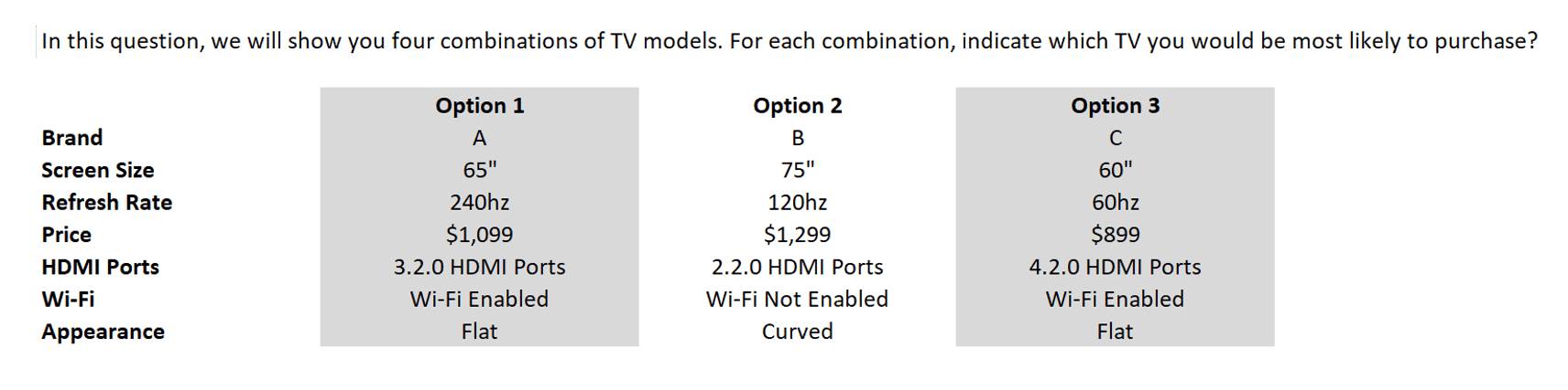 Each feature, or attribute, (e.g., screen size) consists of different levels (e.g., 75”, 60”, etc.). Answer options or concepts are created by combining all levels across all attributes.