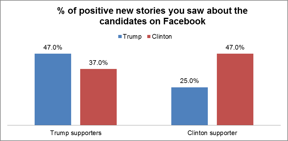 The level of self-selecting of news stories was also very apparent from this survey. The chart below illustrates this beautifully we asked how many of the news stories they saw were positive about the candidate they also supported and both sides had a completely myopic viewpoint on the election.