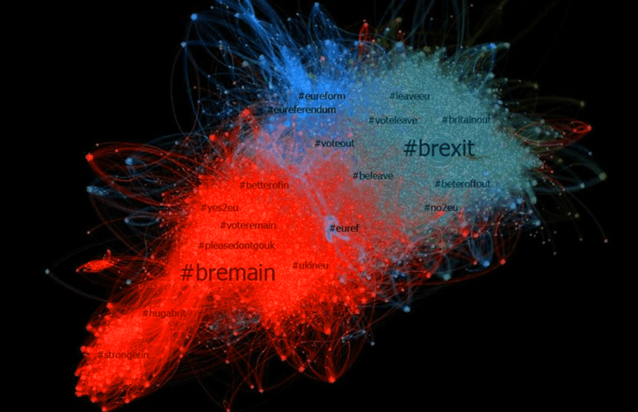As Adam Curtis, the filmmaker has observed in his compelling documentary Hypernormalisation, we are using online as a refuge, a place where we go to get our ideas re-assured. The chart below illustrates the tribal nature of this discourse during the Brexit vote. This is a map of news stories distributed on Twitter:
