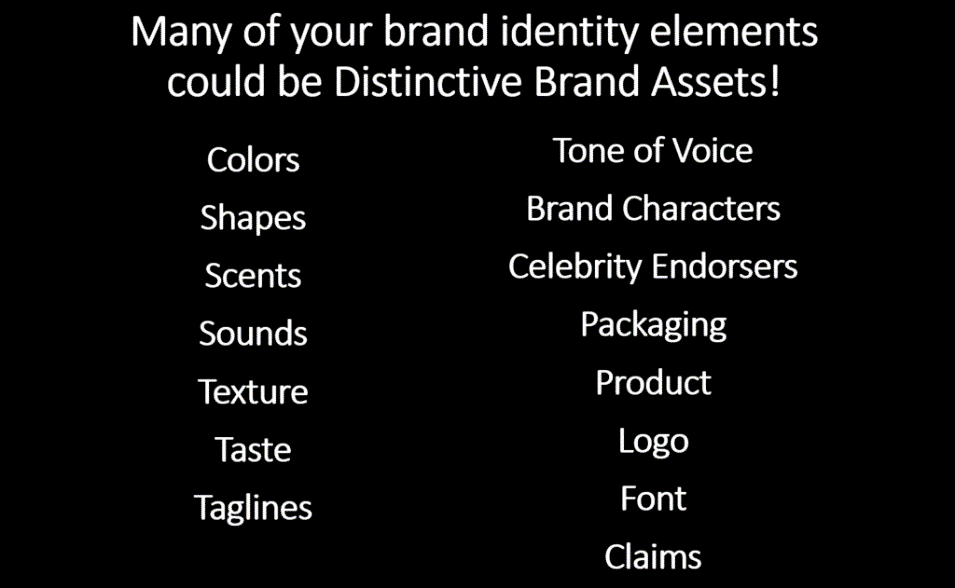 Any element within your brand identity that is unmistakably recognized as belonging to your brand and elicits associations that are “on-brand” is a Distinctive Brand Asset. These include and are not limited to colors, shapes, scents, sounds, tastes, textures, fonts, taglines, packaging, products, logos, claims, tones of voice, brand characters, and celebrity endorsers.