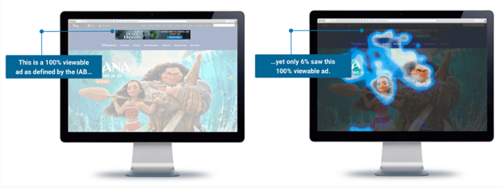 Not so fast. One might assume that all ads above the fold or that pop-up on your screen before browsing a website are seen, however, this is not the case. Just because an ad can be seen doesn’t mean it was actually seen. For example, the below image demonstrates how a 100% viewable ad is only seen by 6% of visitors to this website.