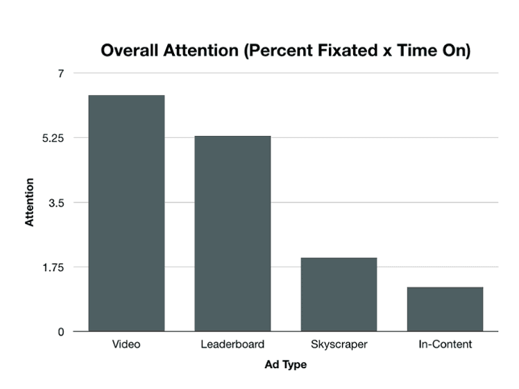 As consumers of the web become more discerning of traditional ad formats, they become more adept at avoiding ads like the skyscraper format, commonly existing on the side of the webpage slightly removed from the main content. Therefore, it’s not surprising to find that this ad format performed significantly worse than the video and leaderboard formats. 79% of participants fixated on it for an average of 2.5 seconds.