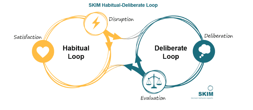 This new behavior environment is so different from the previous bricks and mortar environment, that it calls for a new way of looking at decision behavior. An example of how to think about and disrupt the new curated autopilot environment is shown below. We call it the Habitual-Deliberate Decision Loop.