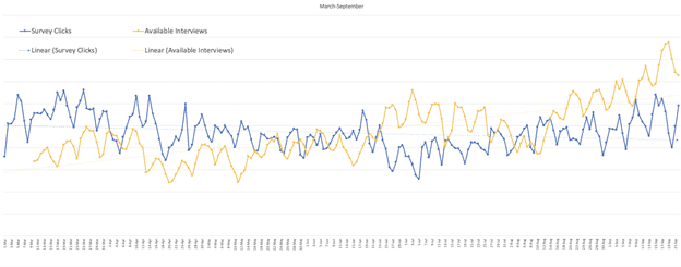 At this point in early July, we saw something we’ve rarely witnessed, which was that the number of available interviews (Demand) was higher than the volume of the daily survey starts, or “clicks” (Supply). This has happened on occasion before, but it became a persistent trend where now the opposite occurrence (clicks are higher than available surveys) is a periodic occurrence.