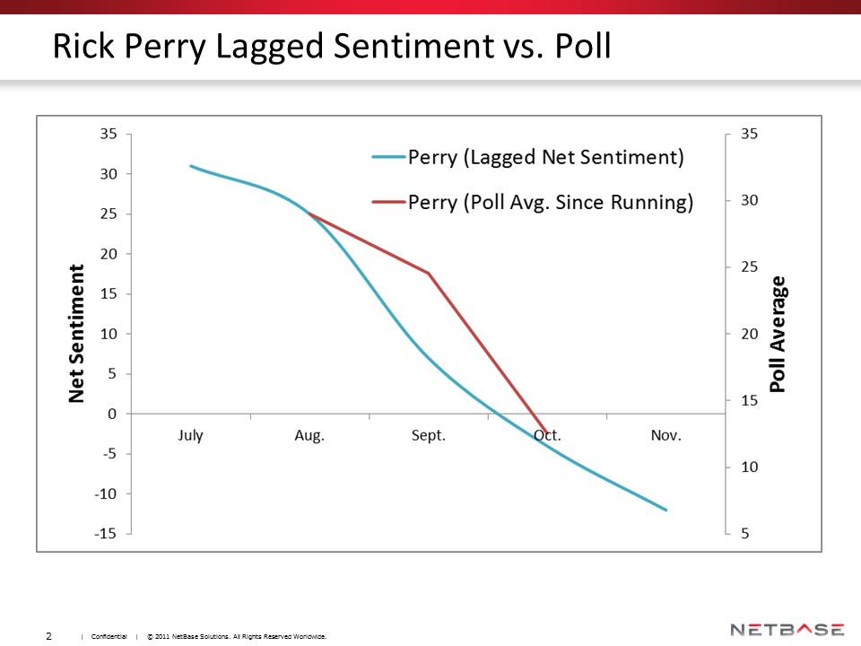 The second research project is still in its infancy, but even the preliminary results could have relevance here. Mitch Lovett and Paulo Albuquerque, also at the Simon School of Business, correlated NetBase’s net sentiment measure to polls for over 30 races in 2010 for Governor and U.S. Senate. Though their results are still tentative, they suggest that net sentiment may lead changes in polls by up to a month. In other words, we might be able to use the net sentiment as a leading indicator of public opinion. We’ll see some anecdotal evidence on this shortly.