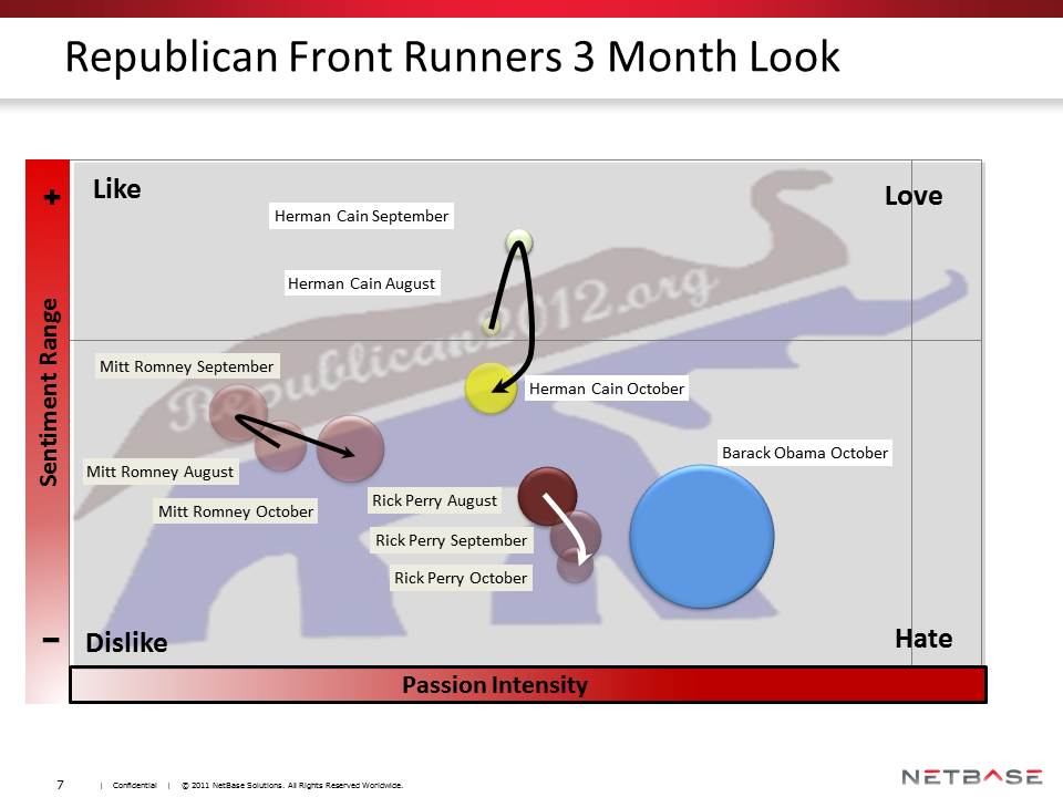 This last picture pretty much sums it up. Perry is heading south rapidly, while Romney is only sliding a little and Cain dropped a lot in his first month in the full public eye. Cain is still the frontrunner on net sentiment, but he and Romney are pretty close on buzz, while Perry’s buzz has been decreasing. Perry is the clear winner on passion while Cain is a little weaker and Romney weaker yet.