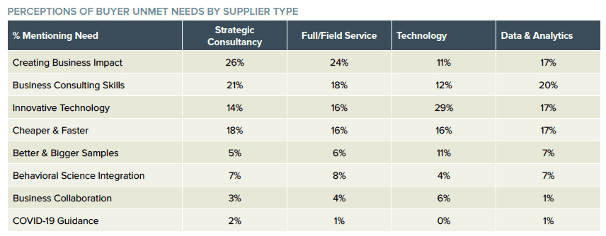 According to Buyers, Suppliers have roles to play in helping them fill unmet needs. Buyer needs range from business-focused to technology-related to analytics to core research skills; Suppliers happen to have specialties in strategic consulting, technology, analytics, and full-service research. On the surface, there may appear to be disconnects between how Suppliers see Buyer needs and the needs that Buyers actually have. However, if you focus on the perspective of the Supplier whose professional focus is best positioned to meet a particular need, Buyers and Suppliers are very well aligned.