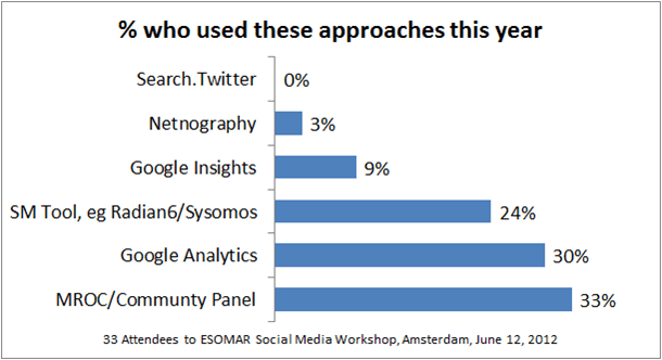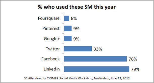 As part of the warm up for the day the delegates were asked what social media related approaches they had used this year and which social media they themselves were a user of. The tables below are not a representative picture of market research; they represent the 33 people who were at the workshop when it kicked off at 9am. The absolute numbers are not relevant, but the relative highs and lows are, perhaps, interesting – particularly as they are quite typical of the feedback I get when I run courses for organizations such as AMSRS and MRS.
