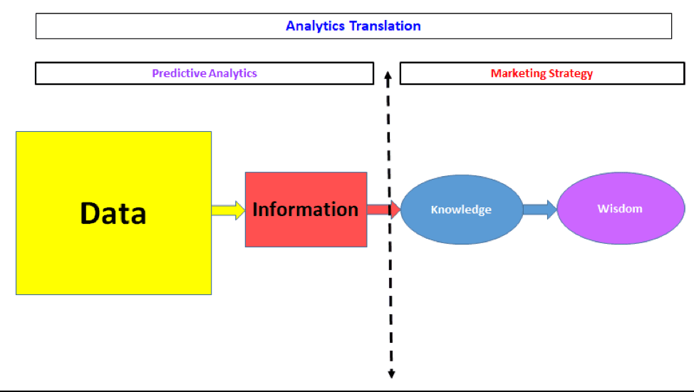 Predictive Analytics professionals calculate results to maximize model efficiency—the Data and Information side of the chart. They are not equipped to present detailed yet summated reports.