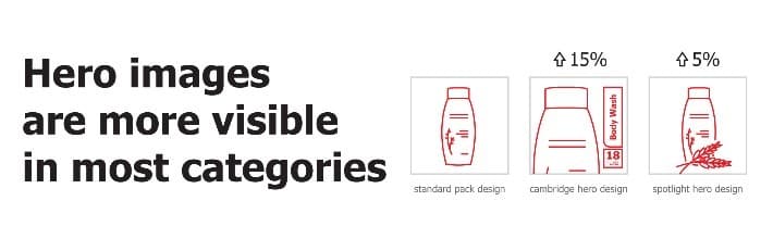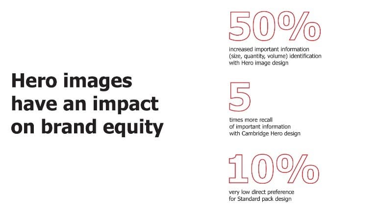 Traditional pack shots are too small to be seen on mobile devices, thus hero images do significantly better when tested with consumers