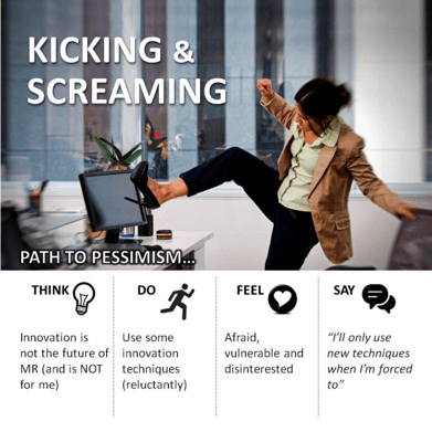 For a large group of pessimists, the experience of working in today’s changing professional environment creates a sense of being dragged along or “Kicking and Screaming.” These researchers do not believe in the value of innovative techniques, have extreme levels of fear about change, and only resort to using more innovative techniques because they are required to do so. Innovation is outside of its core comfort zone. Rather than enthusiasm, these researchers report an overall disinterest in the new directions that MR is taking.