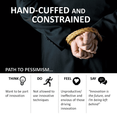 For the second group of pessimists, negative expectations appear to be predominantly driven by concerns for personal prospects for embracing change. This group of “Hand-Cuffed and Constrained” sees the value and potential offered by innovation and wants to be part of innovation, but for various reasons (e.g., client-driven or resource-driven), they are constrained from using these techniques. These professionals feel as if they are stuck standing on the sideline watching the cool kids “ride the wave.”