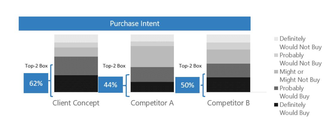 From the standard concept test, results for the Client Concept were promising. When examining Top 2 box scores, the concept outperformed the competition. As often seen in concept tests, the results are harder to decipher when focusing on “definitely would buy.” Here, Competitor B is viewed as a strong contender.