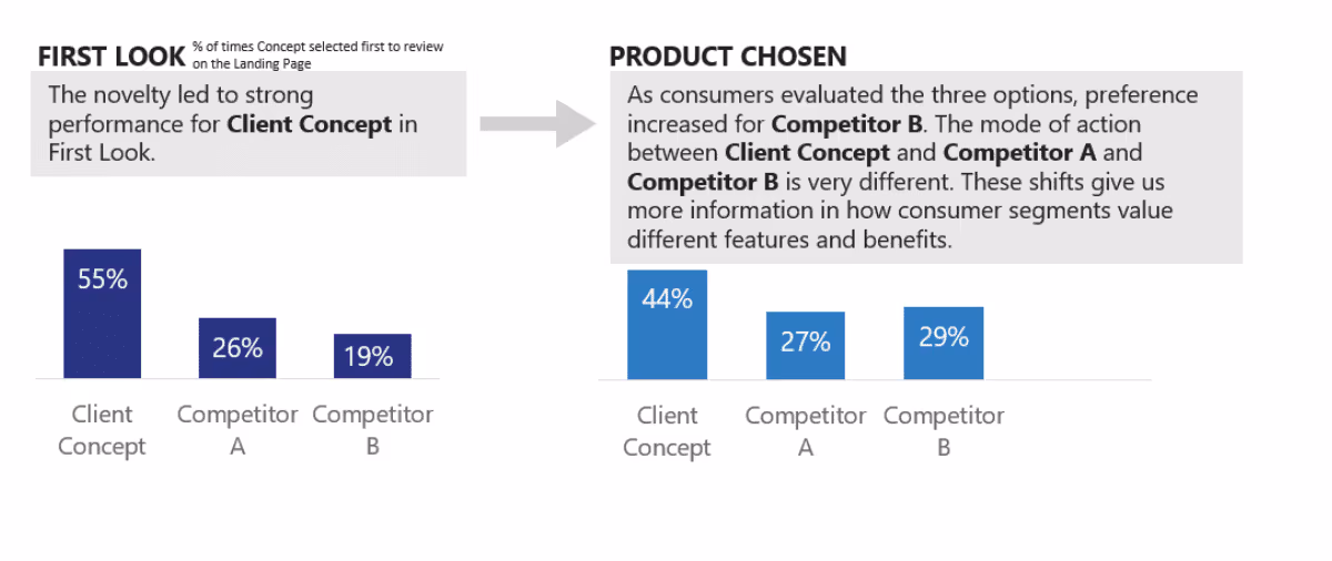 First Look represents the number of times each concept was clicked first on the landing page. While Client Concept had an edge on First Look, some preference shifted to Competitor B as respondents compared options. These shifts are important in understanding how choice is ultimately segmented in the target population.