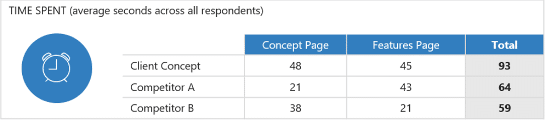 Client Concept was the most heavily researched, telling us consumers were indeed interested in buying this “new to world” innovation. As previously discussed, Time Spent is an important metric as a resonance of a concept is determined by the amount of time people spend reviewing it.