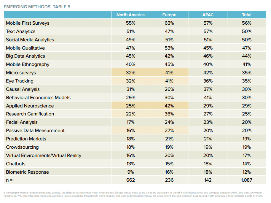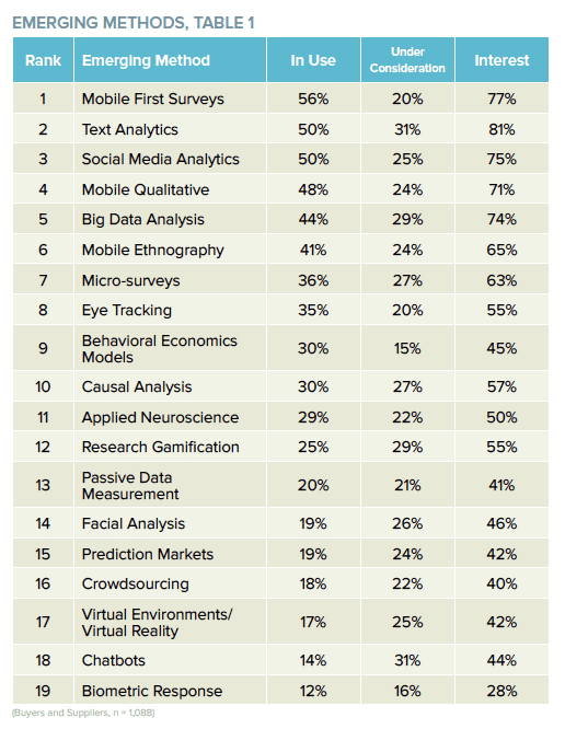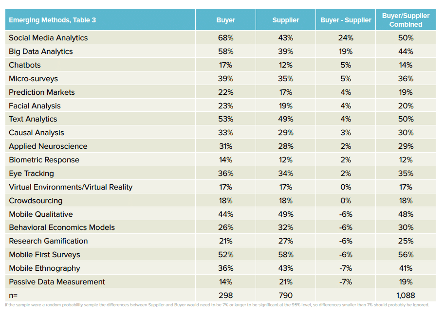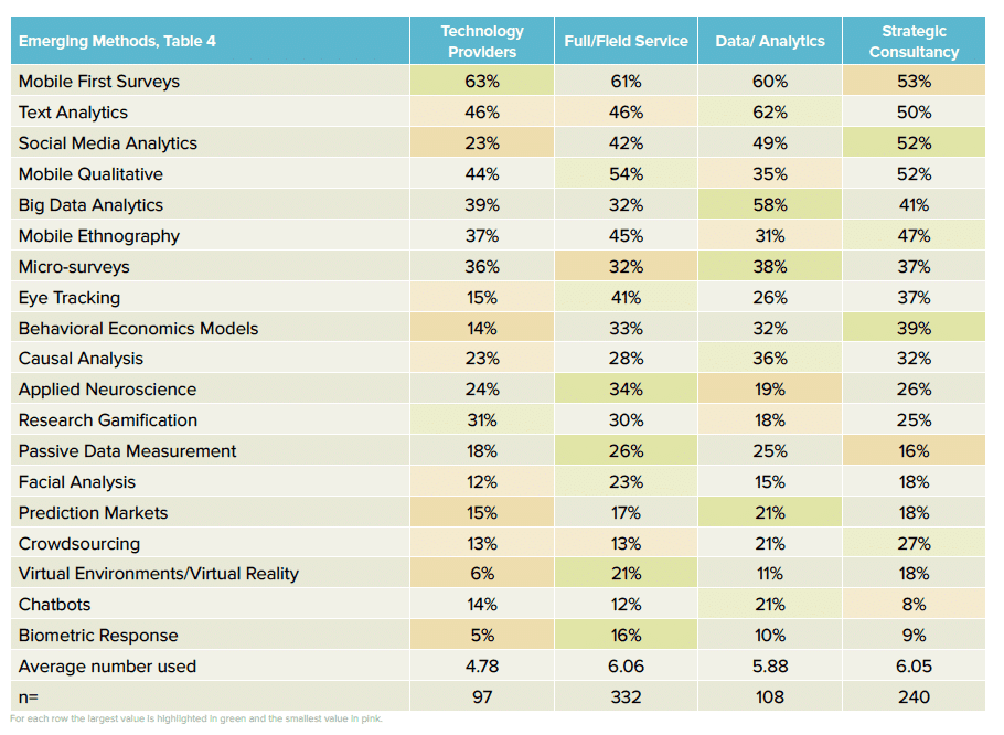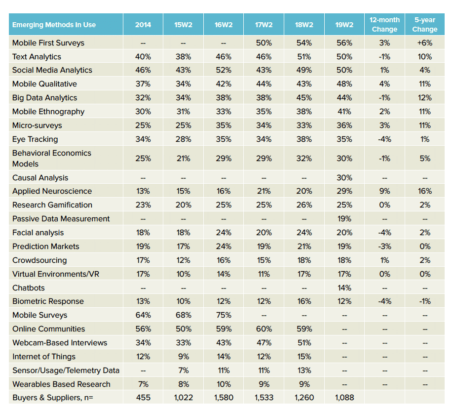 However, behind the short-term stability, there are some interesting long-term trends. Text Analytics, Mobile Qualitative, Big Data Analytics, Mobile Ethnography, Micro Surveys, and Applied Neuroscience are all up 10 percentage points or more over the last five years. These are the real winners and most of the items near the top of the table are there because they have grown in usage over the last few years (unlike Social Media Analytics which was already in widespread use in 2014 and has only grown modestly since.)