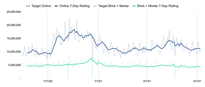 Target is a great example. In the chart below, you’ll see Target’s nationwide behavioral data collected from an app over 13 months. The online traffic is in blue and brick + mortar trips are in green.