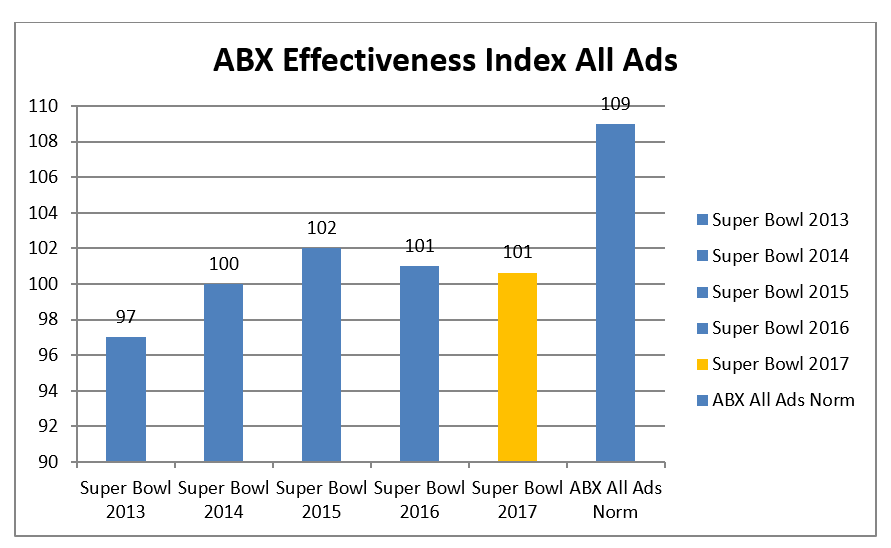 Using Advertising Benchmark’s ABX copy test scores, the overall results for 2017 Super Bowl commercials were nothing to brag about. In fact, using standard ad effectiveness criteria, 2017 ads were a disappointment, at best. Overall scores of the last 5 Super Bowls also generally fall short of ad norms.