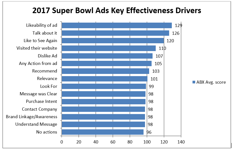 According to Advertising Age, a 30-second Super Bowl ad in 2017 cost about $5 million. That puts total Super Bowl 51 ad spend near $385 million. It seems like many Super Bowl ads focus on gaining viewers likability and it often appears to be a popularity contest. The key question, however, is how well do these ads drive customers to spend money or do some kind of proactive and positive behavior towards the advertised brand. That is the issue we wish to explore here.