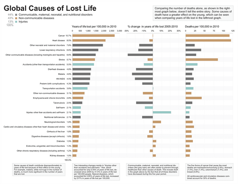 Visualization expert Stephen Few disagrees. He think that Causes of Untimely Death is a poor visualization. He has created an alternative visualization, which he suggests is vastly superior; it is is shown below. In some ways it is a better visualization: it is a lot easier to compare and contrast the numbers. Nevertheless, in a very important way, it is a much worse visualization. It is no longer recognizable as an image. It does not tap into our instinctive skills at finding patterns. It is hard to imagine many people engaging with this beyond 5 seconds.