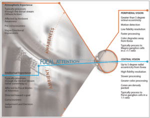 There are ample studies that scientifically measure the brain’s response time to an object detected in the peripheral vision. For example, applying functional neuroimaging (MEG) for mapping brain activity response time, participants were exposed to images in their peripheral visual field[iii]. The brain reacted within 80 milliseconds of latency (lapsed time). This response time is far too fast to be considered a conscious response processed through focal/overt attention.