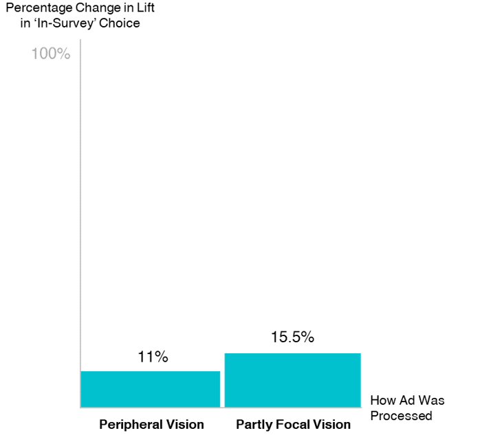Moving from not seeing the ad to seeing the ad in your peripheral vision results in a modest 11% improvement in in-survey brand choice. Moving from not seeing the ad to at least partly seeing the ad with focal sight lifts the prospect of in-survey choice of 15.5%.