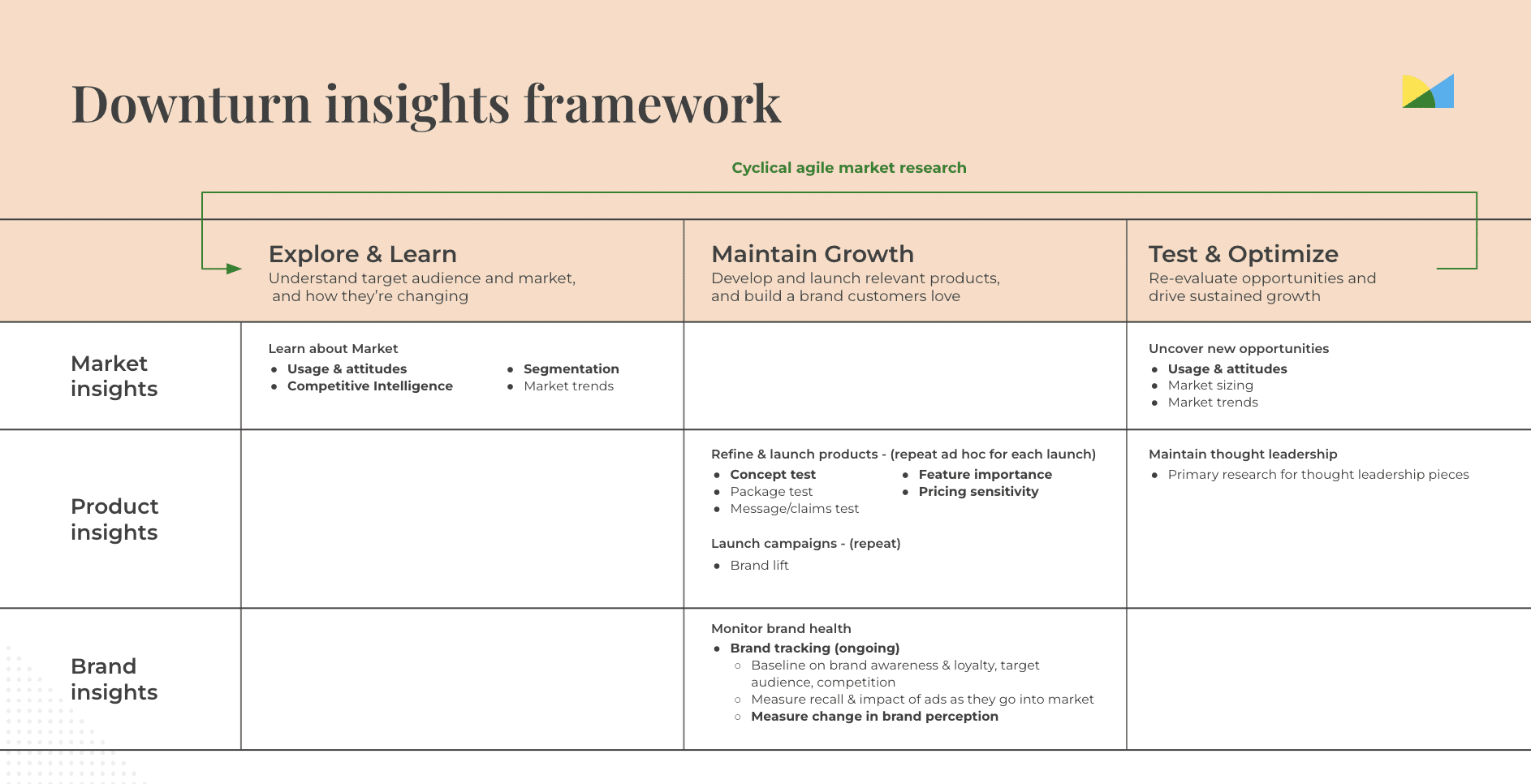 When you conduct research in a repeatable model, you’ll have the insights that guide strategies across the product or brand development lifecycle—whether you’re entering new markets, launching products or campaigns, or searching for new opportunities.
