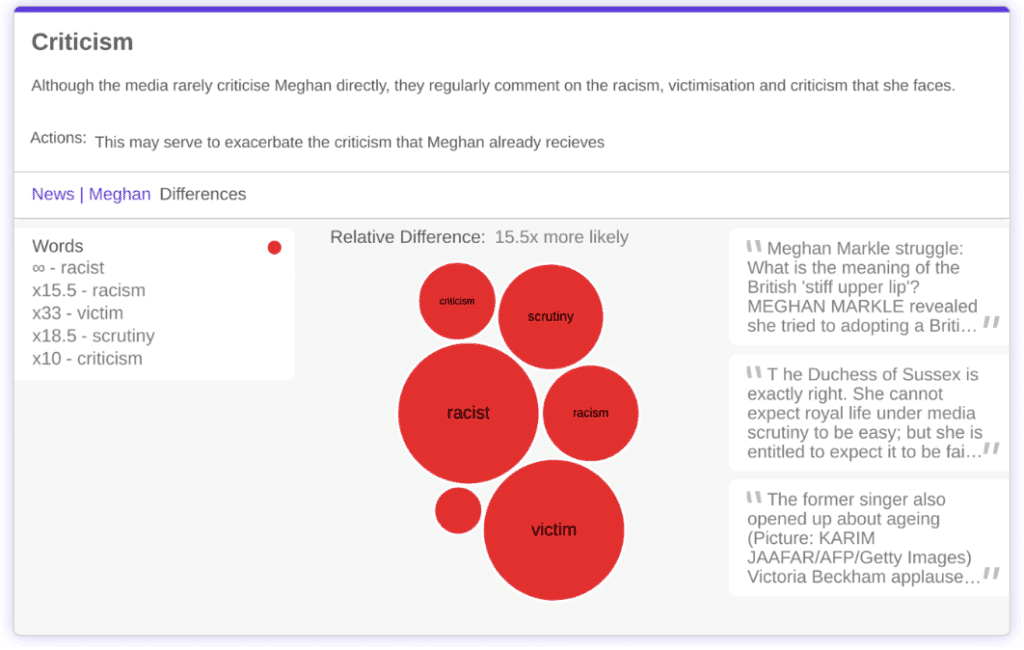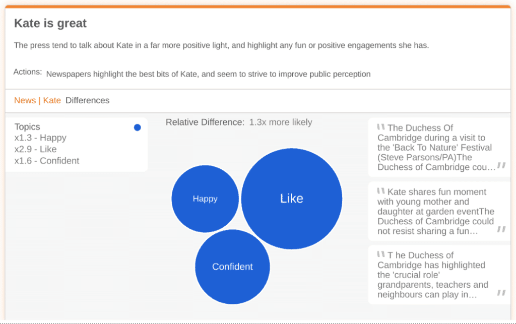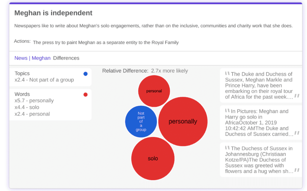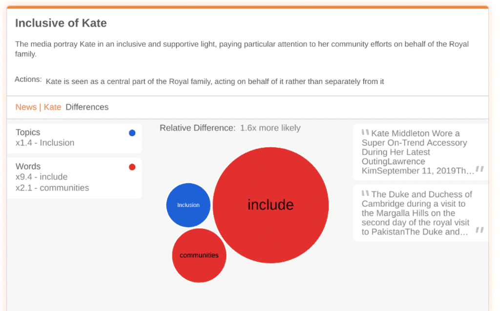 The purpose of Relative’s insights are not to try and confirm what we already know – this article in Buzzfeed highlights tabloid headlines comparing Kate and Meghan’s perceived behavior, the difference is shocking, and we get it, but we want to understand a bit more about what all these articles mean.