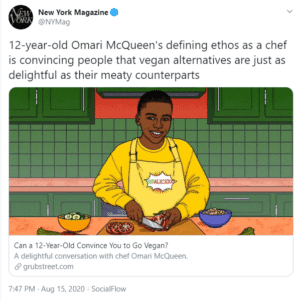 When exploring which chefs vegans are rating right now, we were surprised to discover that it wasn’t any of the celebrity and TV chefs that often dominate social media. Instead, it was 12-year-old Omari McQueen. As the top-mentioned chef in vegans’ conversations, he’s definitely the flavor of the month.