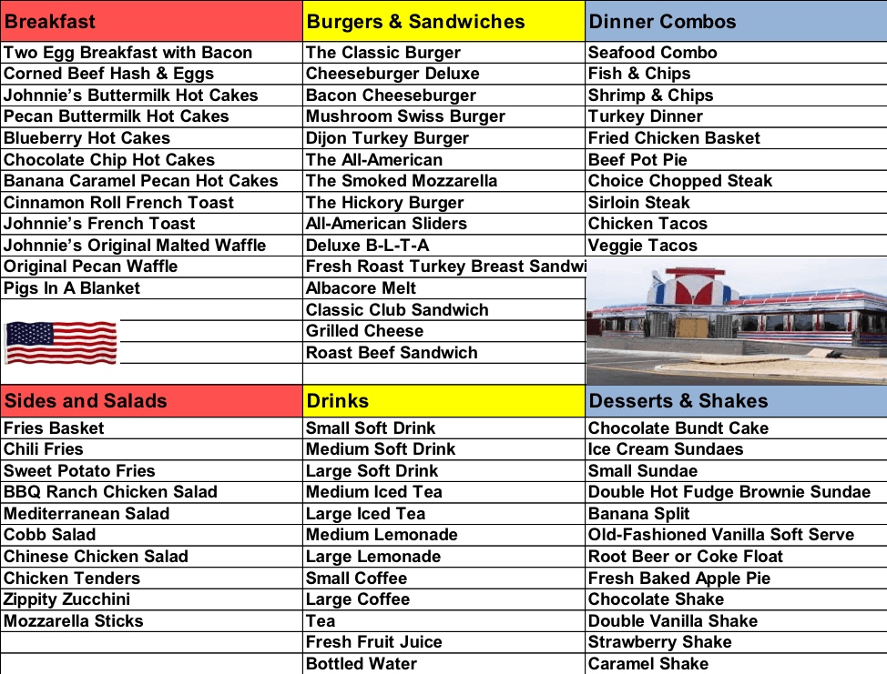 Johnny’s American Diner is a fictional diner chain located primarily in California (named after the Marlon Brando character in The Wild One). Johnny’s American Diner has begun to open branches in the South and in major malls in the Philadelphia area. Given their expansion, Johnny’s American Diner would like to reboot their menu.