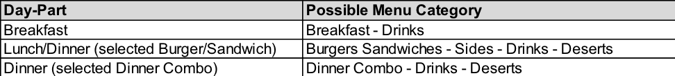 The second section of the study—originally developed by Mitch Markel of the Benenson Strategy Group—was constructed specifically to evaluate the sequence of menu choices respondents make. Johnny’s American Diner envisioned a survey where respondents would be isolated within menu categories. Based on their choices in the TURF section and what time of day they said they usually visited Johnny’s (referred to as day-part), respondents were placed into splits where they were to choose among menu items. No respondent was placed into more than two menu categories. Below is a table of how the selection of menu category was performed.
