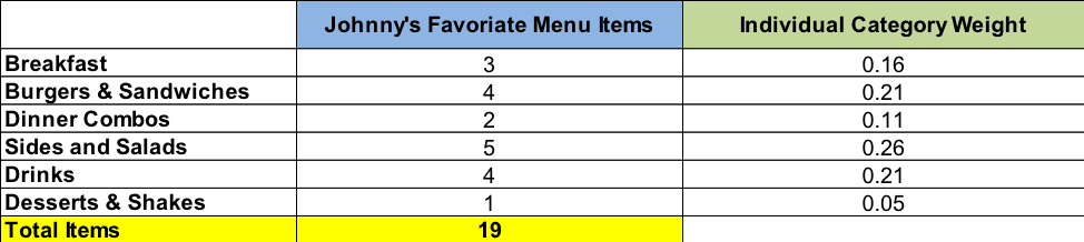 Each respondent was likely to order a different number of items from differing categories. So we decided to add up all his menu choices, then divide that number by each category. The individual category weight would be calculated based on the number of items from each category a respondent chose. Table 1 below gives an example.